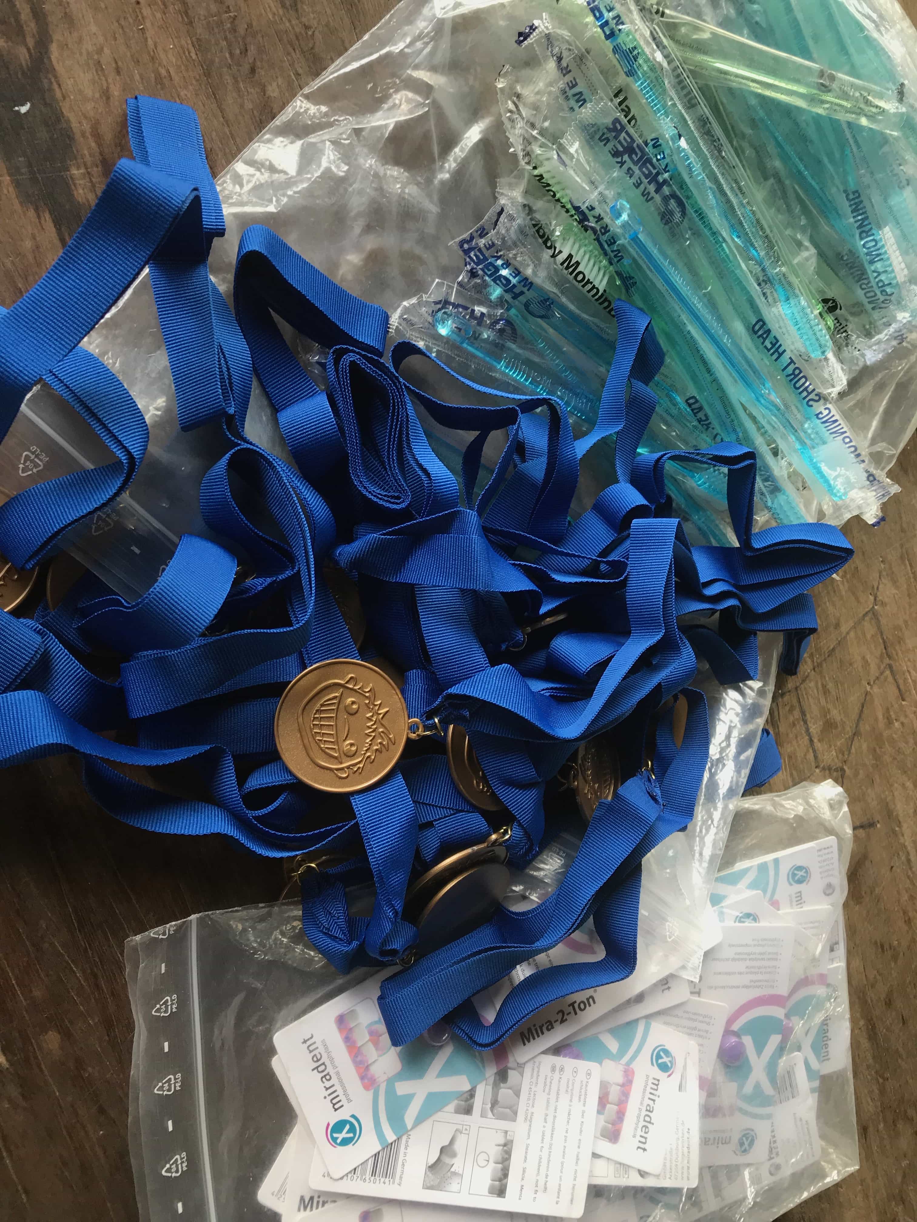 Ausgestattet mit Zahnbürsten, Zahnpasta, Färbetabletten, Sanduhren und natürlich Medaillen haben wir ein vergnügliches Zähne-Wettputzen mit den Kleinen veranstaltet. Selbst die Kinder aus der Vorschule im Alter von 5 Jahren, mit denen ich eigentlich nur das Buch vom Krokodil, das sich nicht die Zähne putzen will, lesen wollte, bestanden auf ihre eigene Zahnputz-Stunde. Alle hatten einen Riesenspaß und ich nach vier Durchlaufen so saubere Zähne wie selten zuvor.
